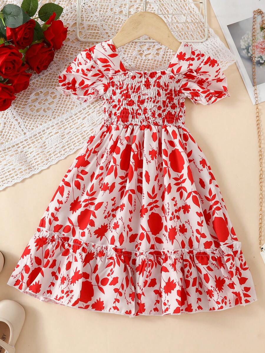 Girls Red Floral Dress – Puff Sleeve Smocked Cotton Dress for Toddlers & Little Girls – Summer Twirl Party Outfit
