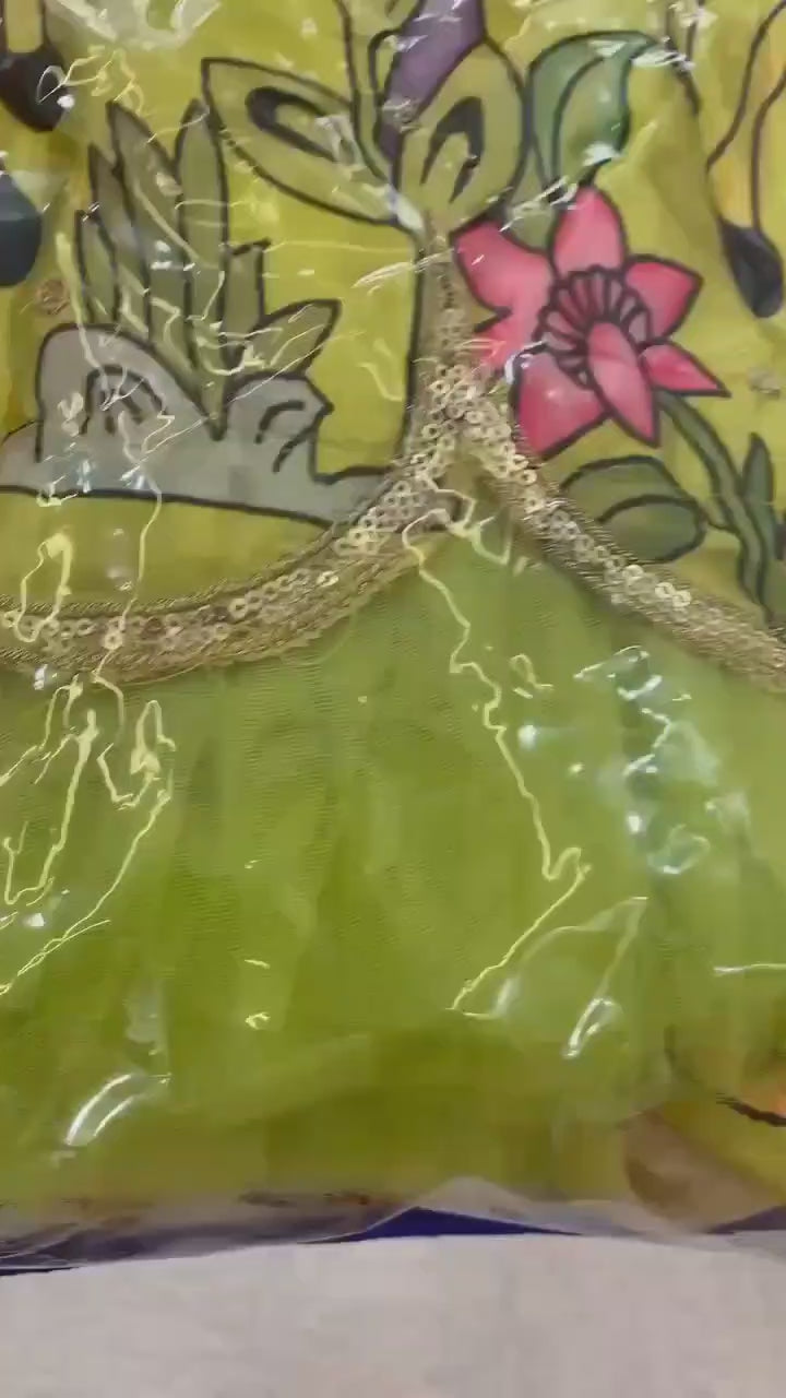 Paired with it is a stunning lime green lehenga featuring colourful hand-painted folk motifs, showcasing elephants, horses, florals, and traditional patterns. The lehenga comes with a scalloped border accented with subtle golden highlights, giving it a premium festive finish.